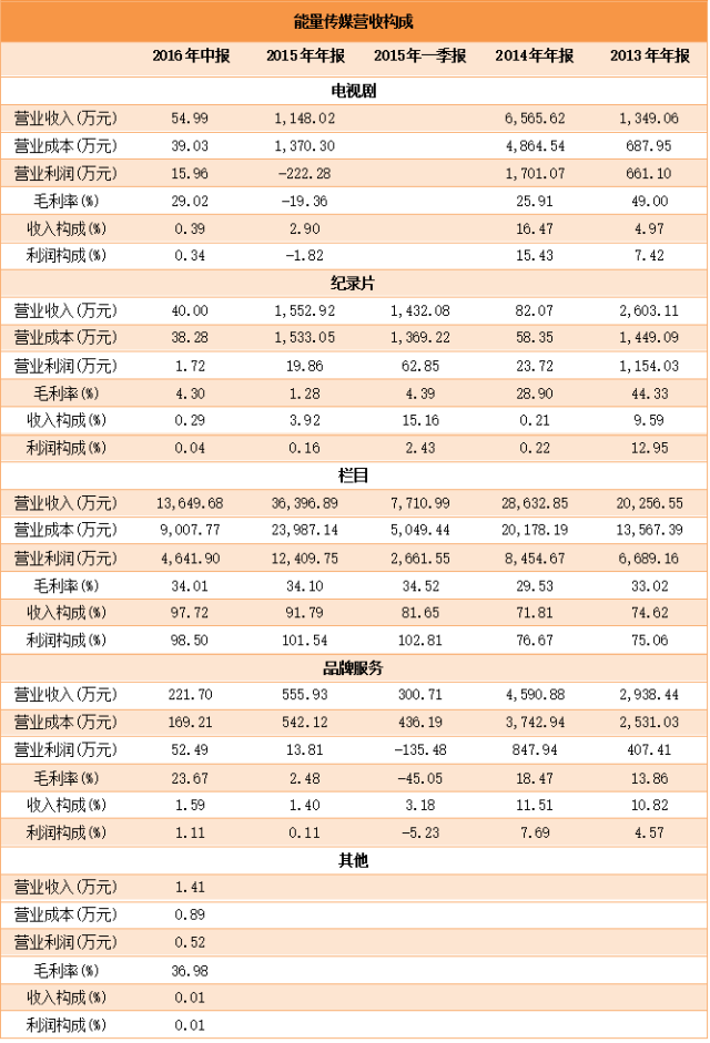 今年上半年,栏目收入是能量传播的主要收入来源,占公司营收总额的97%。但是在去年,能量传播的营收还是由电视剧、纪录片和栏目三驾马车并驱。由多元收入构成变成单一渠道,这对影视公司能量传播来说并非好消息。