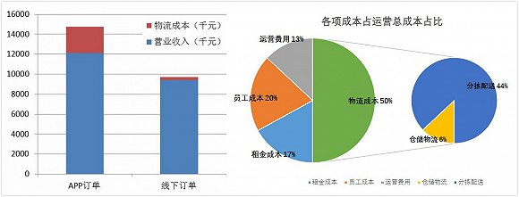 物流成本包括仓储前端物流和后端的分拣配送。其中线上订单产生的分拣配送成本占比80%以上,平均每单末端的物流履约成本高达约13元。线上订单的物流成本远远高于线下订单,导致后者的利润率大大低于前者,APP带来的销售利润远远不能覆盖其带来的物流成本。